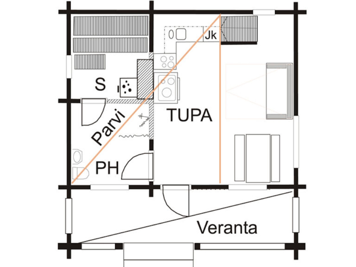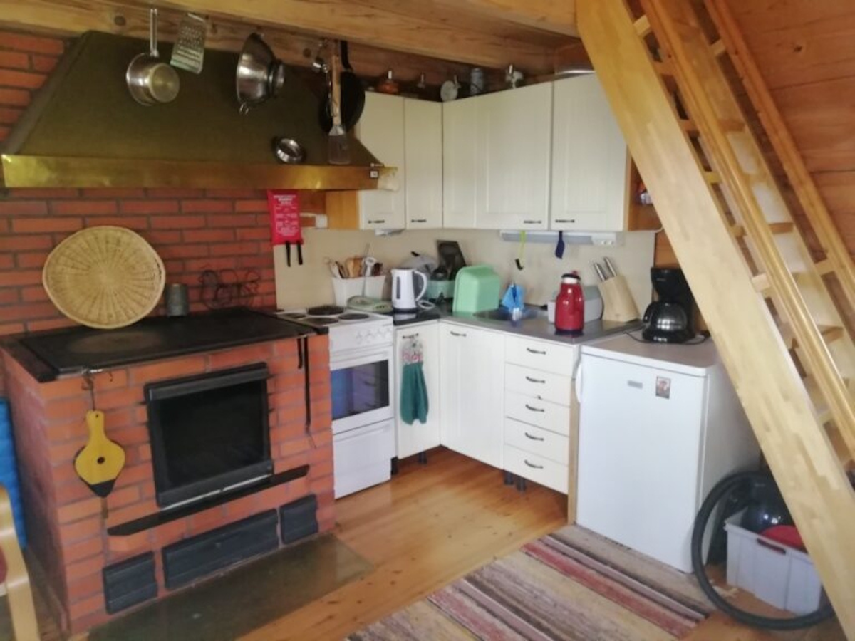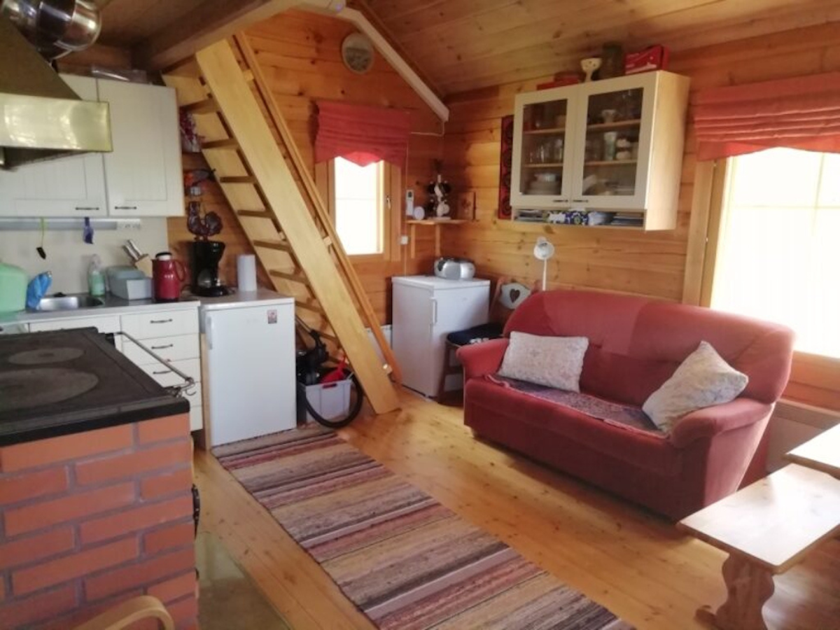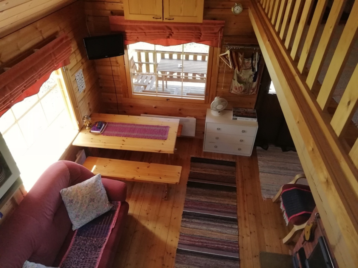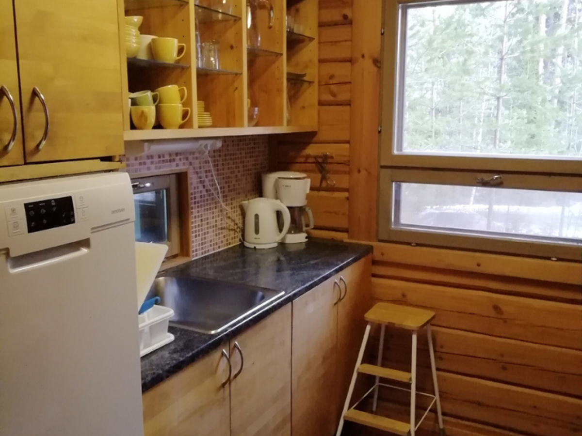Mökissä on tupakeittiö, yläkerran makuualkovi, vuodepaikat 3 (+1), WC, suihku ja oma sauna.